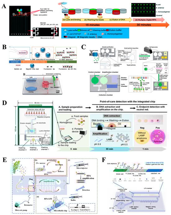 Li et al. [68] developed a centrifugal microfluidic chip designed for the parallel detection of various pathogens in food, including those associated with acute hepatopancreatic necrosis caused by Vibrio spp., white spot syndrome virus, infectious hypodermal and hematopoietic necrosis virus, shrimp hemocyte iridescent virus, and Enterocytozoon hepatopenaei (Figure 2A). This real-time fluorogenic RPA-based chip operates with minimalsample volumes (5 µL) at 39 °C in 20 min, achieving a detection limit of 10 copies/µL. Further advancements are represented by a fully integrated micro-platform developed for the detection of multiple pathogens, including S. typhimurium, S. aureus, B. cereus, Pseudomonas aeruginosa (P. aeruginosa), E. coli O157:H7, Cronobacter sakazakii, L. monocytogenes, and V. parahaemolyticus. This platform incorporates on-chip nucleic acid extraction, RPA, and signal detection [48] within a compact framework, where purified DNA templates were amplified at reduced temperatures (35–43 °C) over varying time periods (5–30 min). The resultant fluorescence images can be acquired via a smartphone, enabling complete analysis within 60 min.