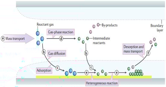 Schematic of general elementary steps of a typical CVD process. Reactant gases (blue circles) enter the reactor (step a). They can either directly diffuse through the boundary layer or adsorb onto the substrate (steps b and c). Alternatively, gas-phase reactions can lead to intermediate reactants (green circles) and by-products (red circles), which are then deposited onto the substrate (steps d, b, and c). Surface diffusion and heterogeneous reactions occur before thin films or coatings form (step e). By-products and unreacted species are desorbed and expelled as exhausts (step f). Adapted from [].