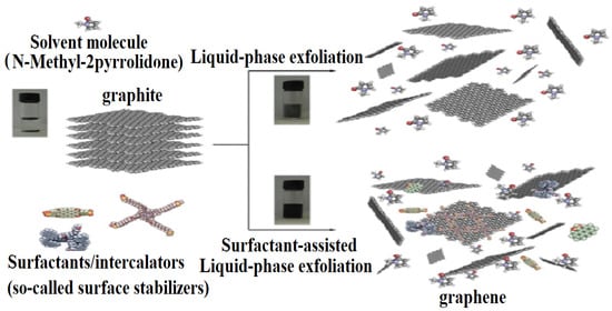 Schematic representation of the liquid-phase exfoliation (LPE) process of graphite in the absence (top-right) and presence (bottom-right) of surfactant molecules. Reproduced from Ref. [].