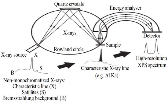 Ideally, scanning electron microscope (SEM) images are of great interest to check the quality and uniformity of Micro-/Nanostructures even up to wafer-scale sizes. Besides, using SEM images, the periodic array of microstructures with different sizes is proved to be the ultimate result of the fabrication process []. X-ray diffraction (XRD) is a common tool to determine the quality of crystallinity and crystal properties such as lattice constant and space group. TEM and electron diffraction patterns are ideally used for nanomaterials characterization. Besides, optical spectroscopy together with newly utilized characterization techniques like scanning tunneling microscope (STM) and atomic force microscope (AFM) found their applications []. Scanning Probe Microscopy (SPM) represents another third-order nonlinear optical technique that holds the potential to analyze the optical nonlinearity of 2D materials [,]. The underlying physical principle of XPS (X-ray photoelectron spectroscopy) and similar photoelectron spectroscopy techniques involves the ejection of electrons from illuminated surfaces (Figure 3). Central to the spectrometer’s operation is the electron energy analyzer, with the electrostatic hemispherical analyzer being the prevalent variant. This analyzer typically comprises two hemispheres positioned concentrically [,,].