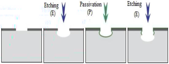 The working principle of standard Bosch DRIE process. In the standard Bosch DRIE process, two types of gases are alternately used in the reaction chamber to realize the etching and passivation steps, respectively. These gases are formed by high-dense plasma ions via glow discharge by RF power. Adapted from [].