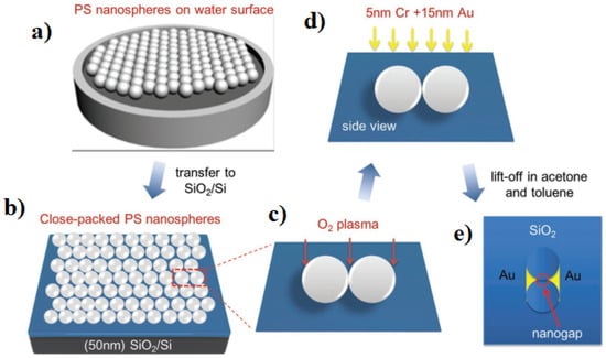 The fabrication of nanogap structures by nanosphere lithography: (a) Large-area monolayer of polystyrene nanospheres on the deionized water. (b) Monolayer of polystyrene nanospheres transferred onto . (c) plasma treatment. (d) Metal deposition. (e) Lift off the polystyrene nanospheres in the acetone and then toluene to form nanogap. Adapted from [].