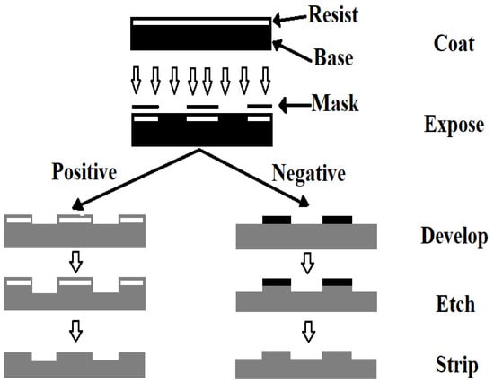 Schematic representation of the photolithographic process sequences, in which images in the mask are transferred to the underlying substrate surface. Adapted from [].