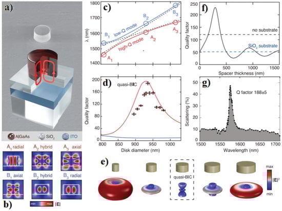 (a) Scanning electron micrograph (top) and schematic (bottom) of an individual dielectric nanoresonator. (b) Simulated near-field patterns of the two modes for different diameters. (c) Calculated mode wavelengths versus resonator diameter. (d) Calculated (lines) and measured (dots) Q factors of modes versus resonator diameter. Calculations in (c,d) are done for a 350-nm spacer. (e) Simulated far-field patterns of the high-Q mode for disks of different diameters are shown schematically. For calculations, is normalized to the full mode energy. (f) Calculated Q factor of the quasi-BIC versus spacer thickness compared with the Q factors of a nanoresonator in air and on a bulk substrate (dashed lines). (g) Measured scattering spectrum and retrieved Q factor of the observed resonance for a disk with a diameter of 930 nm. Adapted from [].
