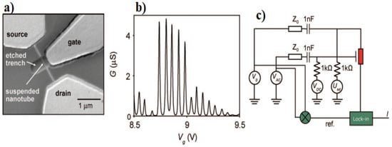 Device geometry of suspended carbon nanotubes, single-electron transistor characteristics, and high-frequency measurement setup. (a) Scanning electron microscope image of a representative suspended nanotube device with source, drain, and gate electrodes. (b) Source-drain conductance versus gate voltage showing Coulomb peaks and single-electron transistor behavior at T ∼ 6 K. (c) Schematic diagram of the measurement circuit. Adapted from [].