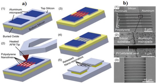 NEMS switches are of great interest as they have good records of leakage current control and as a consequence lead to lower power consumption and improved ON/OFF ratios, where it is possible to control the current flow between source and drain terminals, using electrical and mechanical tools []. The process of design and fabrication of a silicon NEMS resonator is shown in Figure 9. In nanotube-based crossbar memories, two layers of nanotube structures cross by a nanometric gap in which data are WRITTEN by an actuation voltage 2.5 V where the two nanotube ropes make contact. In the case of suspended nanostructure switches, a single nanometric structure is fixed at two ends and suspended over any electrode of a two/three-terminal device. Actuation voltages up to 5 V and sub-3-ns switching times are reported for these structures [].
