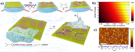 (a) Fabrication of miRNA sensor integrated with antimonene nanomaterials. I The antimonene nanosheets were assembled on the surface of Au film. II AuNR-ssDNAs were adsorbed on the antimonene nanosheets. III miRNA solution with different concentrations flowed through the surface of antimonene, and paired up to form a double-strand with complementary AuNR-ssDNA. IV The interaction between miRNA with AuNR-ssDNA results in the release of the AuNR-ssDNA from the antimonene nanosheets. The reduction in the molecular of the AuNR-ssDNA on the SPR surface makes for a significant decrease of the SPR angle. (b,c) The variation in the sensitivity of the proposed biochemical sensor when the refractive index of the sensing medium is 1.37 + n with respect to the different number of antimonene layers. Adapted from [].