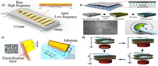 (a) Schematic drawing of the TEABM with eight beams. Each beam is a fixed beam with Kapton film and aluminum foil []. (b) Schematic illustration of the WTNG, Fabrication process of the nanopatterned PDMS structure, FE-SEM images of the bottom textile with nanopatterned PDMS. Inset is a high-resolution image clearly showing the ZnO NR-templated PDMS nanopatterns, a Photographic image of the flexible, foldable WTNG []. (c) Structural design of the LSEG. Schematic of the bent electrification layer with two electrodes on one side, Schematic of a substrate-supported LSEG positioned in water waves. The up-and-down movement of the surrounding water body induces electricity generated between the two electrodes []. (d) Original state, Absorption state under the action of a magnet, Release state when removing the magnet, and Absorption state under the action of a magnet. Adapted from [].