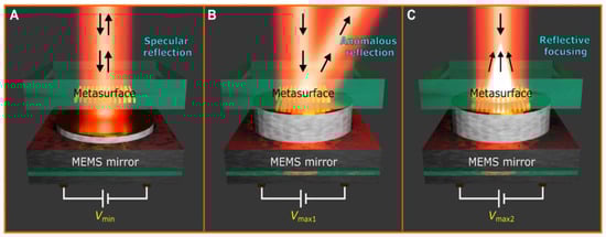 2D wavefront shaping with the MEMS-OMS. (A) Schematic of mirror-like light reflection by the MEMS-OMS before the actuation, i.e., with the initial gap of 350 nm between the OMS nanobrick arrays and MEMS mirror. (B,C) Schematic of demonstrated functionalities, (B) anomalous reflection, and (C) focusing (depending on the OMS design), activated by bringing the MEMS mirror close to the OMS surface, i.e., by decreasing the air gap to 20 nm. Adapted from [].