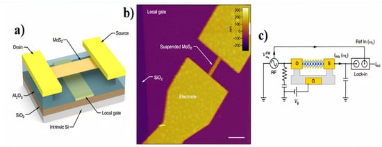 Strain engineering emerges as a viable solution to address some limitations of gapless in graphene nanostructures. Despite its remarkable physical properties, graphene encounters a notable drawback for potential use in electronics—its band structure lacks a gap. The ultimate aim of employing this approach is the development of an all-graphene electronic circuit, where the manipulation of strain allows for the control of electron flow through the circuit []. Elastic strain engineering (ESE) has arisen as a potent technique for continuously and reversibly modifying physical and chemical characteristics, and it can even introduce novel functionalities into materials with low dimensions. Lately, there have been reports of achieving what’s termed “deep ultra-strength”, surpassing half of a material’s theoretical strength, particularly in certain low-dimensional nanomaterials. This achievement is considered a key enabler for what is known as “deep elastic strain engineering” (DESE) [,,]. Rhenium disulfide () shows an anisotropic piezoresistive effect which can be beneficial for the sensing of multidimensional gestures or strain signals []. Thermionic emission and quantum-mechanical tunneling across the barrier result in an impressive giant gauge factor (GF) of approximately 3933 for a strain sensor based on when exposed to laser illumination []. Liu et al. [] showed that the spatial modulation of the local bandgap in molybdenum disulfide can reach up to through thermomechanical nanoindentation, where can be a good candidate for NEMS strain sensors. Figure 13 shows a successful sample of using for fabricating an RF NEMS resonator [].