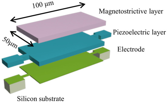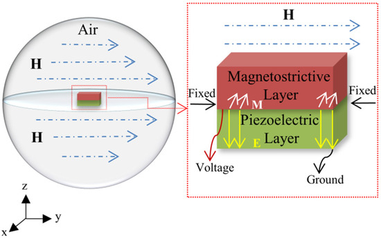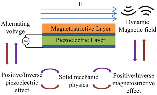 The fundamental elements of ME antennas include the piezoelectric layer and the magnetostrictive layer, as shown in Figure 1. In transmitting mode, an RF voltage is applied to the piezoelectric layer to stimulate an oscillating mechanical strain, which is transferred to the magnetostrictive layer to generate magnetization oscillation and radiate EM waves. Vice versa, in receiving mode, the magnetostrictive layer senses the dynamic magnetic field, generates an oscillating then transmits it to the piezoelectric layer, and finally realizes the output of RF voltage. On the basis of the positive/converse effects involved in the ME antenna, a multiphysics coupling modeling in terms of physics including electric field, magnetic field, and mechanical field is performed by commercial FEM software COMSOL 5.6.