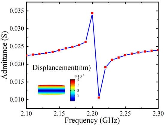 Admittance characteristic curve in thickness resonance mode (The illustration is a displacement cloud image under the thickness vibration mode).