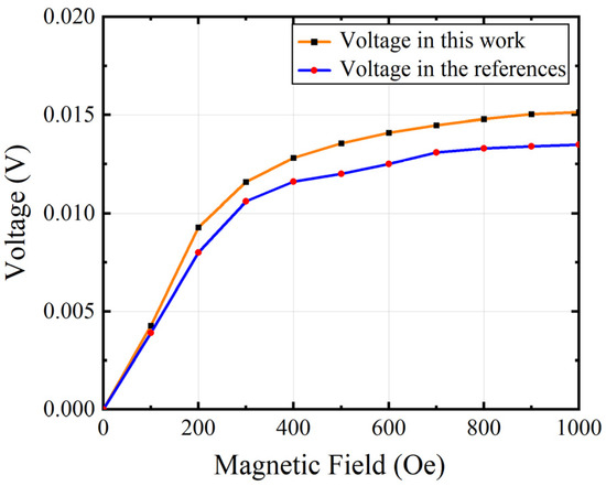 The FEA model consists of an ME antenna with a device size of 100 μm × 50 μm, and the thickness of each layer is 1 μm. And DC magnetic field is applied to the structure in the external air domain and varies from 0 to 1000 Oe. The output voltage in [19] is compared with the simulated output voltage of our model in Figure 5. The results show that there is an acceptable slight deviation between the two curves, which may be due to the inconsistency of the mechanical loss and dielectric loss factors set in the simulation software. Figure 6 shows the ME coefficients of the model simulation in this paper and [19], respectively. The results show the same trend. When is 75 Oe, the ME coefficient reaches the maximum, and the ME coefficient of our model reaches 0.55 V/cm/Oe, and in [19], the ME coefficient reaches 0.52 V/cm/Oe. The simulated results are in good agreement with those reported in [19].