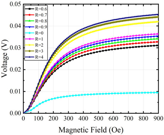 During the modeling, we applied a biased magnetic field in the Y direction to activate the L-T operating mode of the ME antenna, this field consists of a varying and a field. And its positive ME effect process is calculated by using the built-in stationary solver. Figure 7 shows the output voltage changes with different magnetic fields . As shown, the output voltage first increases and then approaches saturation with the increase in due to the nonlinear magnetostrictive structure. It is of note that the output voltage of the ME antenna using the FeGa/FeGaB bilayer is much higher than that using the single-layer FeGaB material (R = 0). The output voltage is enhanced by 4.77 times when R changes from 0 to 4.