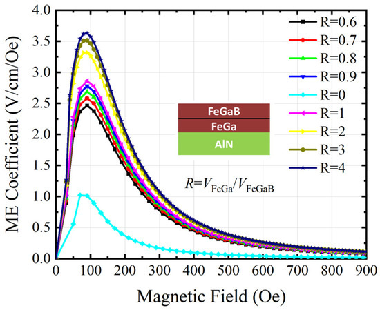 After validation, the output voltage and ME coefficient of the proposed antenna using FeGa/FeGaB bilayer materials with different volume ratios R are studied. R is defined as: