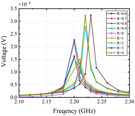 In addition, we studied the output voltage response of the ME antenna at different frequencies. The simulation results illustrated in Figure 9 show the variation of the output voltage at different volume ratios. The results show that the output response is the strongest and the output voltage is the largest at the resonant frequency. The results verify that the resonant frequency of the device varies due to the different material properties and volume radios of the two materials. In addition, the output voltage amplitude is also improved.