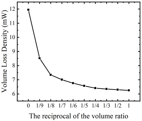 Because the laminated ME antenna combines the characteristics of the two materials, the good soft magnetic characteristics of FeGa and the relatively good microwave characteristics of FeGaB, the use of the FeGa/FeGaB structure not only improves the magnetoelectric performance compared with the use of single-layer FeGaB but also reduces the electrical loss generated by the use of single-layer FeGa material. Under the above conditions of AC/DC magnetic field superposition, we studied the eddy current loss under different volume ratios. As shown in Figure 10, when the volume ratio is 1, the decrease trend tends to be saturated, and the eddy current loss is reduced by 52.08%.
