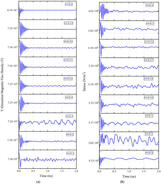 (a) Dynamic distribution of magnetostrictive layer flux density in Y direction; (b) Dynamic stress field of magnetostrictive layer.