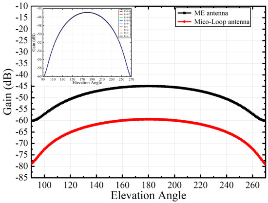 The inset in Figure 15 shows how the gain varies with the angle when the volume ratio of FeGa and FeGaB changes. The results demonstrate that the variation of antenna gain is almost unchanged when the volume ratio R is changed, and the curves almost overlap. When the volume ratio R becomes 1, the antenna gain reaches the maximum value of −44.88. The overall results show that the maximum gain of ME antennas using a laminated structure is higher than that of single-layer FeGaB. This is because the FeGaB/FeGa composite structure can reach higher inverse magnetoelectric conversion efficiency, thus obtaining a better far-field radiation performance.