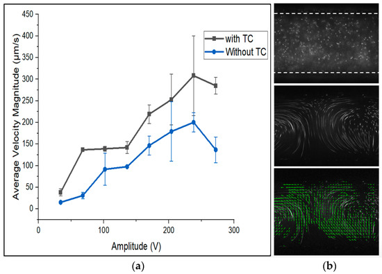 (a) The effect of an active temperature control system on the average magnitude of velocity in flow profiles: (b) top image: A channel filled with 1 µm polystyrene static particles. Middle image: The flow profiles movement with acoustic energy. Bottom image: The characterized movie shows tiny (green) velocity vectors (Refer to Videos S1 and S2 in the Supplementary Materials for recorded experimental movies).