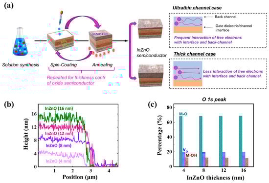 (a) Fabrication scheme of solution-processed InZnO semiconductor films and thickness control via repeated coating and annealing, (b) film thickness date (measured by AFM), and (c) chemical bonding states (metal-oxygen (M-O), oxygen vacancy (VO), and metal hydroxide (M-OH)) of thickness-controlled InZnO films.