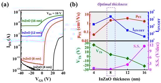 (a,b) Electrical characteristics of TFTs fabricated using thickness-controlled InZnO semiconductors: (a) IDS–VGS transfer curve and (b) figure-of-merits (ION/Off, μFE, VTh, and S.S.).