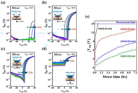 (a–e) Transfer curve shifts of TFTs fabricated using thickness-controlled InZnO semiconductors under PBS tests: (a) 4 nm thick InZnO, (b) 8 nm thick InZnO, (c) 12 nm thick InZnO, (d) 16 nm thick InZnO, and (e) the summarized result.