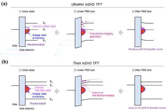 As shown in Figure 3a, a PBS test using a gate bias stress condition of +10 V for 7.2 ks was performed to evaluate the operational stability of oxide TFTs using thickness-controlled InZnO thin films. All the TFTs, regardless of the thickness of the InZnO film, have similar gate dielectric/channel interfaces and back-channel conditions, indicating that they contain almost the same charge-trapping sites. However, as shown in Figure 3a, the TFT with a 4 nm thick InZnO film exhibited a significant positive shift in the transfer curve despite a short stress time. The transfer curve shifts excessively in the positive direction beyond the measurement range during the PBS test. This is because free electrons in the narrow-channel region are frequently trapped at the active subgap states present in the gate dielectric/channel interface or can easily interact with the surrounding oxygen gas molecules at the back channel. As shown in Figure 4a, when the charge-trapping defect states near the gate dielectric/channel interface were not filled with electrons, they actively captured free electrons under the PBS stress condition, causing a dramatic positive directional shift in the transfer curve. In contrast, as shown in Figure 3b–e, the instability under PBS stress can be overcome by increasing the thickness of the InZnO film. The ∆VTh of TFTs under PBS is 13.1, 8.7, and 6.2 V for InZnO films with a thickness of 8, 12, and 16 nm. As shown in Figure 4b, the thicker semiconducting films contained more electron carriers. Thus, in the initial state, many subgap states that contribute to charge trapping at the gate dielectric/channel interface are already filled. These electron-filled subgap states do not serve as active electron-trapping sites in the PBS test. This indicates that fewer active trapping sites exist in thicker InZnO films, despite having almost equal amounts of charge-trapping sites near the gate dielectric/channel interface and the back channel. Thus, the shift in the positive direction of the transfer curve in the PBS test was significantly reduced when the thick InZnO films were used. However, the deterioration of the interface state in thicker InZnO films is evident due to the excessive application of multiple spin-coating steps. Therefore, the utilization of thicker InZnO films leads to a notable reduction in the positive shift of the transmission curve during PBS testing. Conversely, the sub-threshold swing (S.S.) experiences severe degradation under these conditions. Hence, whether the film thickness is ultrathin or ultrathick, the device performance tends to decrease. As shown in Figure 2b, that optimal performance is achieved at a thickness of 8 nm.