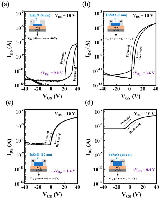 Hysteresis properties of InZnO TFTs using thickness-controlled InZnO semiconductors with film thicknesses of (a) 4, (b) 8, (c) 12, and (d) 16 nm.