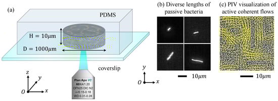 The entire experimental observation process took place within a thin cylindrical cavity on a Polydimethylsiloxane (PDMS) chamber, as illustrated in Figure 1. The cavity had a height of 10 μm and a diameter of 1000 μm. Concentrated bacteria (strain BS168) were used to generate active flows with coherent flow structures, and bacteria (strain AW405) with fluorescent dye were used as the non-motile elongated particles. The motility of AW405 was eliminated by removing the flagella, and their length can be tuned by adding an antibiotic. A drop of a mixed solution of concentrated BS168 and extremely dilute AW405 was introduced onto the glass cover slip and finally sealed with the PDMS chamber. The PDMS chamber was gas permeable, thus maintaining the motility of the bacteria for a certain time of around 30 min. We performed image acquisition with an inverted fluorescence microscope (Nikon Ti2-E, Nikon Corp, Tokyo, Japan) equipped with a high-speed camera (ORCA-Flash4.0 V3, Hamamatsu Photonics, Hamamatsu , Japan), focusing at the middle height of the channel. Two objective lenses of (NA = 0.6) and (NA = 1.2) were used with a visual field of about (/px) and (/px). Then, the movements of the fluorescent AW405 and non-fluorescent BS168 bacteria could be recorded in the fluorescent field and bright field, respectively, at a corresponding frame rate of 25 Hz and 50 Hz, with the same resolution of 2048 × 2044 px. The continuous sequence of bright-field images captured by the microscope provided the flow field information of the bacterial activity throughout the entire field. The PIVlabs macro in MATLAB 2020a analysis allowed us to obtain the velocity field from the raw video. Throughout all the PIV measurements, key parameters such as the window size and step size were set to 128 and 32 px, respectively. Subsequently, the optimal interrogation window size between the adjacent frames was calibrated to be 43.52 μm by 43.52 μm with a minimum lattice spacing of the velocity field 10.88 μm. The velocity field shown in Figure 1 illustrates the velocity vectors at each lattice. In addition, the spatial correlation of the bacterial activity flow structures could be determined using the velocity correlation function , where denotes the spatiotemporal averaging. By fitting the data to the exponential decay function , the correlation length could be calculated.