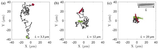 Typical trajectories of non–motile bacteria of different body lengths and the swimming bacteria with a concentration of 36 , where the green bacteria shape indicates the start of the trajectory and the red bacteria shape indicates the end posture. (a) , (b) , and (c) .