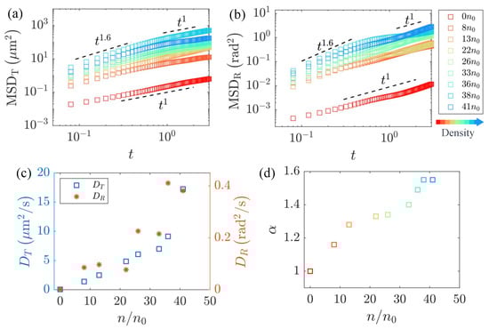 In the flow field generated by the freely swimming bacteria, the velocity decreases with distance following a decay law when far from the boundaries. However, as the bacteria approach the boundaries and move near solid surfaces, the velocity decay is even faster, following a pattern [,]. If the swimmer is confined between two no-slip walls, as in our flat chamber with a height H, then the flow field becomes exponentially decayed at distances [], suggesting the bacteria in the quasi-2D system with boundaries need a higher concentration to have a shorter average free path and to form collective motion under the hydrodynamic interactions between individuals []. Therefore, in our experiments, the relationship between the translational diffusion coefficient and the rotational diffusion coefficient with respect to the concentration did not exhibit a particularly distinct transition, as indicated in the reference literature []. This absence of a pronounced transition hindered our ability to determine the critical concentration at which the bacterial suspension underwent a transition from disorder to order. However, by empirical evidence, loosely speaking, about 1% of the volume fraction of the bacterial suspension was recognized as the critical concentration, above which the coherent flows were generated by the coordinated bacterial swimming [,]. By fitting the superdiffusive portion of the curves, we obtained the variation of the diffusion exponent with the number density, as depicted in Figure 3d. The diffusion exponent consistently increased monotonically with the bacterial concentration, indicating that the straight motion of the passive rod-like particles became more pronounced at higher bacterial concentrations, and the obtained results are consistent with those reported in the reference literature [].
