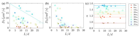 In order to better understand the influence of the length of the passive rod-like particles on their diffusion behavior, we introduced the antibiotic cefamandole during the cultivation of the non-motile AW405 bacteria to tune the body length. To comprehensively elucidate the influence of the passive particle length and bacterial concentration on the diffusion, we conducted calculations for the translational diffusion coefficient , rotational diffusion coefficient , and superdiffusion exponent of the passive particles at different bacterial concentrations, as depicted in Figure 4. Figure 4a,b reveal a monotonic decrease in both and with an increase in particle length L. Since the viscous drag forces acting on moving particles are proportional to with a constant cross-section, this leads to a decrease of the diffusion coefficients with the aspect ratio. We think that the cause of this phenomenon is longer particles, and the fluid may induce greater frictional forces, which could be a primary factor contributing to the observed decrease in diffusion. Additionally, it is noteworthy that the superdiffusion exponent of passive particles, as shown in Figure 4c, is largely associated with the background flow field and exhibits minimal dependence on particle length.