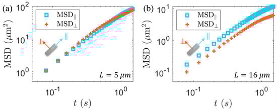 However, in biological systems, in addition to the spherical symmetric structure, particles commonly exhibit shapes that are anisotropic, such as ellipsoids, fibers [], and contractile proteins []. This anisotropic nature results in the dynamic behaviors of particles that are markedly distinct from those of spherical particles, including directional variations and intricate coupling between translational and rotational motion. The behavior of anisotropic particles in passive fluids has been extensively studied theoretically and experimentally [,,,,,,]. One year after the development of spherical particle theory, Albert Einstein extended Brownian dynamics to include rotational freedom, leading to the exploration of ellipsoidal particle diffusion. Francis Perrin quantified these observations in 1930 [,]. Vasanthi et al. used molecular dynamics simulations to study ellipsoidal particles within spherical ones, finding a linear relationship between translational diffusion coefficients and the particle aspect ratio. Vasanthi suggested that, initially, particles exhibit anisotropic diffusion dominated by translation. As time progresses, rotation becomes influential, resulting in a gradual transition from anisotropic to isotropic diffusion at long timescales [,]. Han et al. observed the quasi-two-dimensional Brownian motion of ellipsoidal particles in water, confirming a transition from short-term anisotropic to long-term isotropic diffusion in the laboratory coordinate system. However, in the intrinsic coordinate system, particle diffusion remains anisotropic, without a transition to isotropy [,].