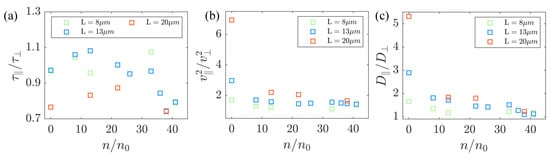 where or ⊥. Assuming a low correlation between the magnitude and direction of the velocity, Equation (3) can be expressed as follows: , , Here, represents the angle between the particle velocity direction and its major axis and denotes the kinetic energy of the particle. Furthermore, due to the exponential decay of the autocorrelation function of the velocity directions, we have: , , where the correlation time represents the characteristic time of the spontaneous flow in the bacteria’s active flow. Finally, the ratio of the diffusion coefficients can be expressed as: . The combined effects of these parameters result in the observed differences in the diffusion coefficients, as illustrated in Figure 6. In Figure 6a, we observe that the ratio of the correlation time along the two axes shows a slight decay with strong fluctuations. This differs from the results in previous work [], in which the time ratio monotonically goes from greater than 1 to less than 1 along the bacterial concentration. We believe that this difference is due to the irregularity of the shape of the passive bacteria, compared to controllable ellipsoidal particles. Additional, in Figure 6b, the parameter is greater than 1 at low concentrations, gradually decreasing to approach a constant value around 1 at high concentrations. However, in the current work, did not exhibit values less than 1. This observation is primarily attributed to the confinement of the chamber utilized in our experiments. This constraint restricts the correlation length of the background flow field, resulting in a scarcity of passive bacteria with body lengths much smaller than the correlation length. However, the ratio of the translational diffusion coefficients along the long and short axes decreases with increasing bacterial concentration in Figure 6c, consistent with previous work.