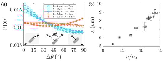 To comprehensively understand the observed phenomenon, we speculated that it is likely related to the flow structure of the background flow field. Therefore, we measured the correlation length of the background flow field at different bacterial concentrations, as shown in Figure 7b. To further validate our hypothesis, in the laboratory coordinate system, we measured the absolute angle between the long axis p of passive particles and the instantaneous velocity direction. The probability density distribution of is illustrated in Figure 7a. If an ellipsoidal particle moves along its major axis, . Conversely, corresponds to the transverse motion of the passive particles. We observed that, when the length L of the passive particles exceeds the correlation length of the active flow, the probability density distribution peaks at , indicating a preference for diffusion along the long axis. Conversely, when L is less than , the peak of the probability density distribution gradually shifts towards , suggesting a tendency for diffusion along the short axis.