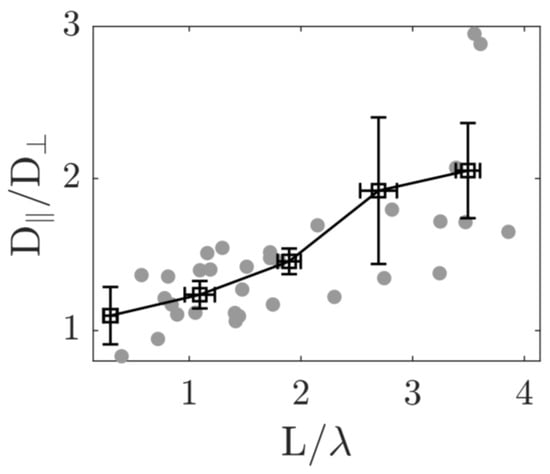 The analysis suggests that the length of the passive particles L and the correlation length of the background flow field are crucial parameters determining the direction of passive particle diffusion. Subsequently, we related the anisotropic diffusion of the passive particles to the flow structure of the active flow and studied the ratio as a function of . The results in Figure 8 show that increases monotonically with . This indicates that, when is small, i.e., when the particle length is much smaller than the correlation length of the background flow field, the particle is influenced by a single coherent stream in the active flow, which drives the particle motion along the short axis. For particles with a length greater than the correlation length, they are simultaneously influenced by multiple streams, causing the passive particles to preferentially move along their long axis.