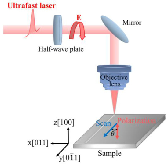 The experimental setup is shown in Figure 1. In our experiments, the sample is a single-sided polished p-type single-crystal silicon with a resistivity ranging from 0–20 Ω/cm and a crystal orientation of <100>. A Gaussian spatially distributed linearly polarized light with a wavelength of 1030 nm, repetition rate of 100 KHz, and pulse width of 1.2 ps is generated using an ultrafast laser system (Monaco, Coherent, Bangkok, Thailand). The continuous and precise adjustment of laser power is achieved through a combination of a half-wave plate and a polarizer. The laser beam is focused by an objective lens (Mitutoyo 2×, NA = 0.055, focal length f = 100 mm) and it is vertically incident onto the sample surface in air. A zero-order quartz half-wave plate in front of the objective lens is used to adjust the laser polarization direction. The three-dimensional motion platform (Aerotech ANT130) with a repeatability of ±75 nm enables precise movement of the sample within the laser focal plane. The crystal orientation, laser polarization direction, and sample scanning direction are defined in Figure 1, and the orientation of the sample’s scanning direction with respect to the crystal’s axis direction was determined by EBSD (electron backscatter diffraction).