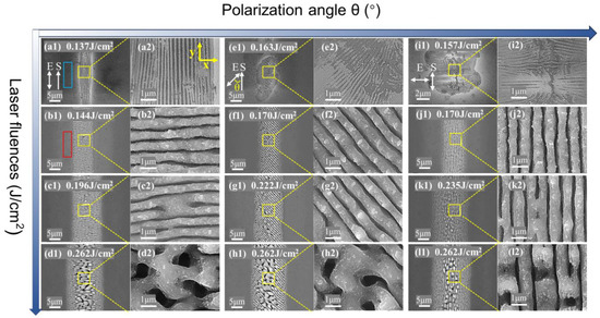 In different polarization states, the edges of the HSFL∥ modified region are regular periodic fringes parallel to the laser polarization direction, as shown in Figure 4a–f. However, the regularity of the central part deteriorates, which may be related to the weakening of the feedback assistance effect of the surface stripes generated after the previous pulse on the unscanned area in the scanning direction. That is, when the direction of the fringes is the same as the scanning direction (θ = 0°), the near-field enhancement generated by the formed nanofringes has the strongest effect on the orderly guidance of subsequent fringes, and gradually decreases with the increase in the angle between them.