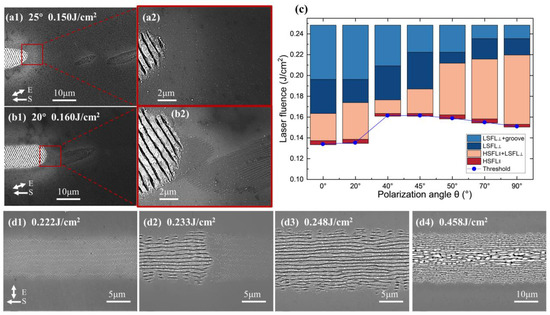 (a,b) SEM images of the mixed state of HSFL∥ and LSFL⊥ on the surface of single-crystal silicon under incident picosecond laser irradiation with a polarization angle of 25° and 20°. The corresponding energy densities of (a,b) are 0.150 J/cm2 and 0.160 J/cm2, respectively. (a2,b2) are local magnification diagrams of (a1,b1), respectively. (c) The energy density windows of different typical morphologies and generation threshold curves of LIPSSs generated by picosecond laser irradiation on single-crystal silicon surface at different polarization angles. (d1–d4) SEM images of the nanoparticles, mixed state of nanoparticles and LSFL⊥, LSFL⊥, and grooves on the surface of single-crystal silicon under incident femtosecond laser irradiation at a polarization angle of 90°, respectively. The corresponding energy densities of (d1–d4) are 0.222 J/cm2, 0.233 J/cm2, 0.248 J/cm2, and 0.458 J/cm2, respectively.