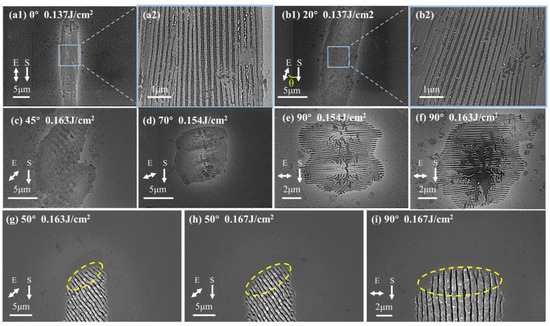 The HSFL∥ shown in Figure 4a–f and the LSFL⊥ shown in Figure 4g–i, which generated by incident lasers with different polarization states. They both show obvious polarization-dependent anisotropy, that is, with the change in the laser polarization direction, HSFL∥ forms an elliptical modified region with its long axis parallel to the laser polarization direction, instead of the circular region of the Gaussian spot. Along the laser polarization direction, the ablation of the front segment of the LSFL⊥ is also enhanced, which may be attributed to the enhancement of directional scattering field due to the higher energy absorption efficiency in this direction. And along the scanning direction, the modified region is connected in different overlapping ways and areas, from 0° to 90°, following a gradual change from connecting the long axis of the elliptical modified region to the minor axis.