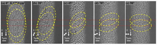 SEM images of LSFL⊥ on the surface of a single-crystal silicon irradiated with different polarization angles. (a–e) The polarization angles are 0°, 20°, 45°, 70°, and 90°, respectively, the energy density is 0.177 J/cm2, the scanning speed is 8 mm/s, and the pulse repetition rate is 100 KHz. The yellow elliptical dotted lines represent the elliptical modified regions formed when the laser irradiates the silicon surface with different polarization states and the long axis of these ellipses is parallel to the direction of laser polarization. The relative position of the modification area movement, determined by the fixed scan speed and pulse repetition rate, is indicated by a red dotted line.