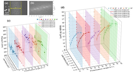 The characteristic parameters of LSFLs generated by laser irradiation on the surface of single-crystal silicon irradiated at different polarization angles were analyzed. The SEM image shown in Figure 6a was processed using the two-dimensional fast space Fourier transform method, as depicted in Figure 6b. Through this method, the periodicity corresponding to LSFLs, as shown in Figure 6c, was obtained. The period of LSFLs generated by irradiation under the same polarization state does not vary much with increasing energy density. The period of LSFLs generated by laser irradiation with different polarization states shows the maximum at 45° and the minimum at 0° over the entire range of energy densities. The variation in the modification width of LSFLs with increasing energy density under different polarization states is shown in Figure 6d. Under irradiation in the same polarization state, the modification width increases with increasing energy density. However, under irradiation in different polarization states, the modification width almost reaches its maximum at 90° in the entire range of energy densities. And the closer the polarization angle is to 45°, the smaller the modification width becomes, which can also be seen visually in Figure 5.