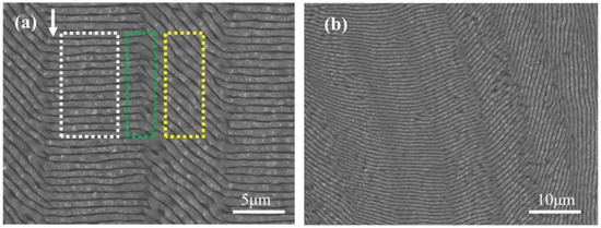 To achieve a large-area meta-surface based on LIPSS arrays with angled stitching on the surface of single-crystal silicon (100), as illustrated in Figure 7, it is crucial to consider the polarization-dependent anisotropy of LIPSSs mentioned above. The white rectangle on the left side of Figure 7a contains LSFLs created at a polarization angle of 0° with a periodicity of 720 nm ± 67 nm and a modification region width of 9.05 μm ± 0.21 μm. Within the yellow rectangle on the right, at the same energy density but with the polarization angle adjusted to 45°, the LSFLs have a periodicity of 780 nm ± 148 nm and a modification region width of 7.45 μm ± 0.22 μm. When stitching these two sets together, in addition to considering the appropriate gap for stitching, it is also necessary to address the drop in stitching quality due to inconsistent periodicity on both sides. For the more complex pattern processing displayed in Figure 7b, resolving the stitching quality issues for LIPSSs at multiple angles is even more complicated. These challenges are not within the scope of this paper; however, in future work, it is hoped that by using different laser wavelengths to affect the periodicity of LIPSSs, it might be possible to compensate for the differences in periodicity between LIPSSs of various polarization states to improve the quality of stitching.