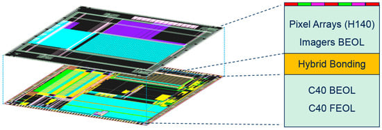 Figure 1. 3D integration of pixel arrays and CMOS image sensors at the top tier H140 (Lnom = 140 nm) stacked by hybrid bonding with a bottom tier in C40 (Lnom = 40 nm) for the logic part of the image sensor with back end of the line (BEOL) and front end of the line (FEOL) parts.