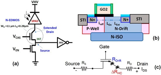 The logic part of a SPAD cell has different processed devices; one is a drain-extended N-channel (N-EDMOS) transistor (Figure 2a), used for its switching capability. This results in a small on resistance (ROn), a bias range with a sustainable large drain voltage (VDS), while the gate-voltage (VGS) is limited to VDS/2 to avoid breakdown of gate-oxide. This is related to the N-drift region (with respect to p-well) designed (Figure 2b) as a drain extension in series with channel, with an overlap length (Lov) with the gate and an extension (Lext) to the drain terminal. The optimization of the EDMOS architecture depends on several factors, such as the gate-oxide thickness (Tox), the lateral isolation by locally oxidized silicon (LOCOS) or by a shallow trench isolation (STI) [13,14]. It is also strongly related to the silicon [11] or silicon on insulator (SOI) substrate [15,16], the presence of a body buried layer [17] and the use of super junction [18]. These parameters lead to a different tradeoff between performance and device reliability. HCD can be used as it tests the N-EDMOS robustness due to the reduction in current drivability and device lifetime, induced by the source-drain resistance increase (RSD) (Figure 2c) in the drift region [14,15].