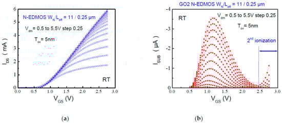Figure 3. First step of the QS technique in Leff = 0.25 µm N-EDMOS (a) Measurement of the IDS-VGS curves done with a small VDS step (VDS = 0.5 V to 5.5 V step 0.25 V) in order to cover all the DC bias points submitted to a fresh device under (AC) operation. (b) Measurement of the substrate current ISUB—(VGS, VDS) for the same voltage range that shows the second hump at high VGS due to 2nd impact ionization occurrence, that can reach avalanche mode depending on VGS (VDS) magnitude.