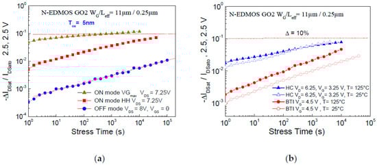 Figure 4. (a) Saturated drain current reduction at room temperature (RT) plotted as a function of VGS stress between On mode at VDS = 7.25 V under HH condition, VGSmax = VDS/2 and Off mode at VDS = 8 V and VGS = 0. (b) Same criterion used to compare On mode damage at VGSmax (VDS = 6.25 V) and PBTI for VGS = 4.5 V (VDS = 0) between room temperature (RT = 25 °C) and 125 °C (DC) stressing.