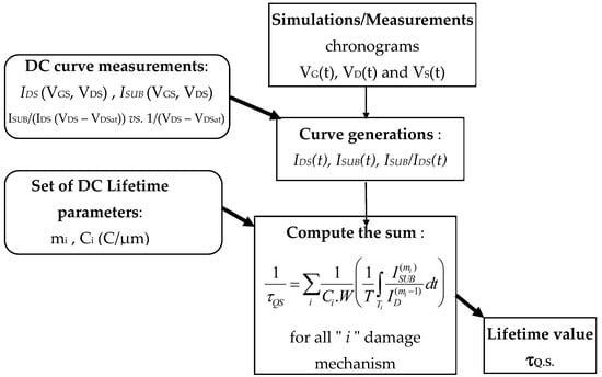 Figure 5. Program sequence of the QS lifetime extraction based on (1) VD, VG, VS signal timing as a function of the N-EDMOS waveforms (2) the generation of the experimental curves from the DC IDS (VGS, VDS) ISUB (VGS, VDS) from Figure 3a,b which are transferred to every voltage condition found at each timing point of the chronogram. (3) Calculation of the QS lifetime with the set of lifetime parameters (mi, Ci) as the sum of each damage mechanism “i”, of duration Xi. This is moved automatically to the waveforms, i.e., as a function of VDS = VD − INT and VGS = VCAS − INT (Figure 2a), for Off-mode (0 ≤ VGS < VTh), HH stress (VTh ≤ VGS < 0.18 VDS), ISUB stress (0.2 VDS ≤ VGS < 0.44 VDS) and VGSmax stress (corresponding to 0.46 VDS ≤ VGS < 0.5 VDS). This enables in the final step to calculate the QS lifetime considering the duty cycle factor αduty and pulse shape αshape of the waveforms.