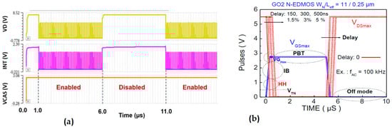 We have applied the QS technique [31,32,33], illustrated in Figure 5, by considering the timing results obtained by TCAD simulation (shown in Figure 6a) for the N-EDMOS device in the SPAD cell (Figure 2a). N-EDMOS device is switched in the cell with the potential variation of photodiode detector at its drain during enabled/disabled cycles [2], here with a frequency (fAC) of 100 kHz. Since the N-EDMOS source is switched by INT potential (Figure 2a), it varies VDS, VGS applied to the transistor where VGS = VDS/2 under the low SPAD illumination duration (Figure 6a), with a frequency of 10 MHz. This effect switches the transistor between On- and Off- mode through body effect on VTh despite VG (VCAS) being constant. Hence, the On-mode frequency (Figure 6a) chosen for TCAD is 10 MHz, while the longer Off mode is implied with 5 µs duration under low illumination. This enables us to obtain the low to high frequency range (Figure 6a,b), which would imply the possible influence of recovery effect (when VDS = 0). This latter has not been observed using constant pulse shape experiments [30]. Therefore, we obtained AC results (Figure 6b) that conformed to the EDMOS waveforms independently of the frequency by fixing the pulse shape αshape = tr,f/TAC for a given delay. This enabled us to obtain the load variation range between the output and input of the pulsed transistor (i.e., between VDS and VGS) into the SPAD cell.